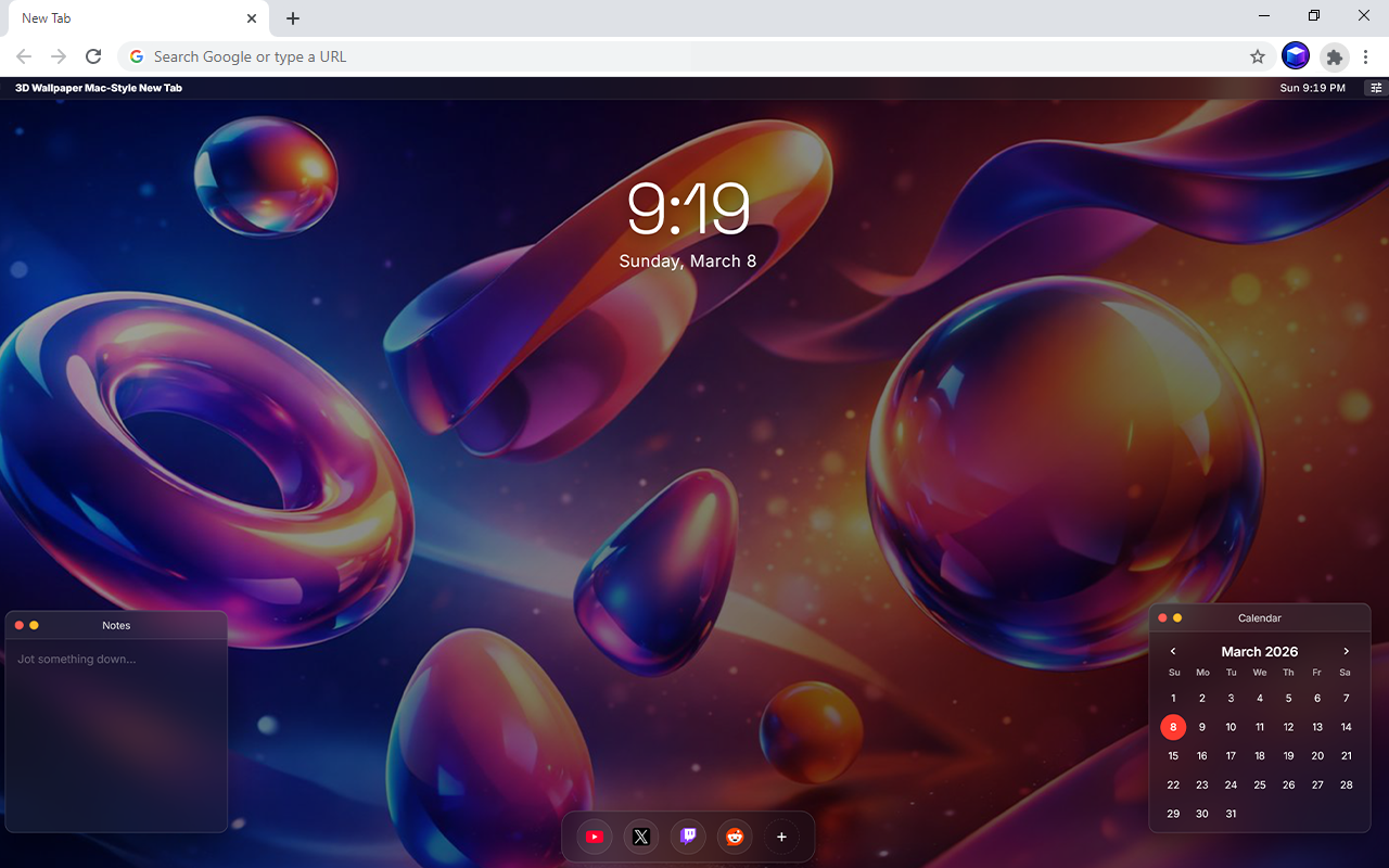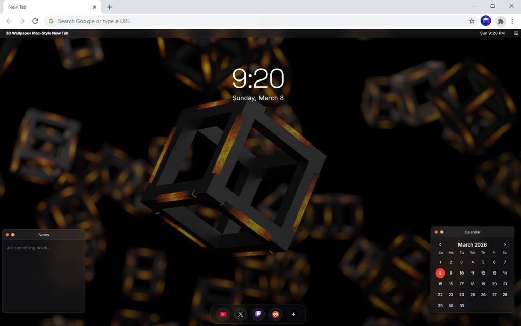 3D Wallpaper Mac-Style New Tab replaces your default new tab with a clean mac-inspired interface featuring immersive 3D backgrounds, useful tools, and customizable shortcuts.