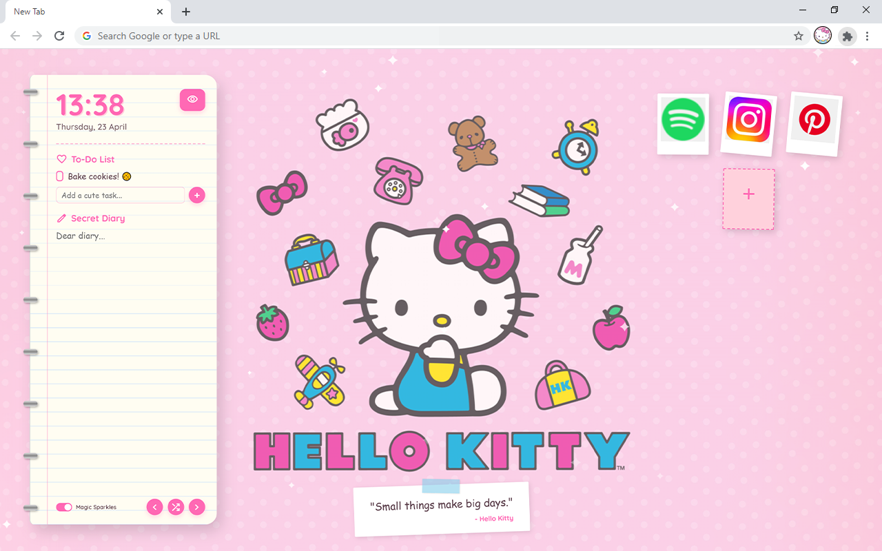 ✓ Spiral Notebook Dashboard: The left side of your screen features a realistic notebook interface. This panel looks adorable over any active hello kitty background you choose.