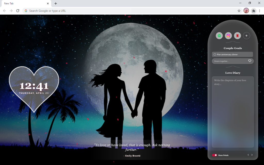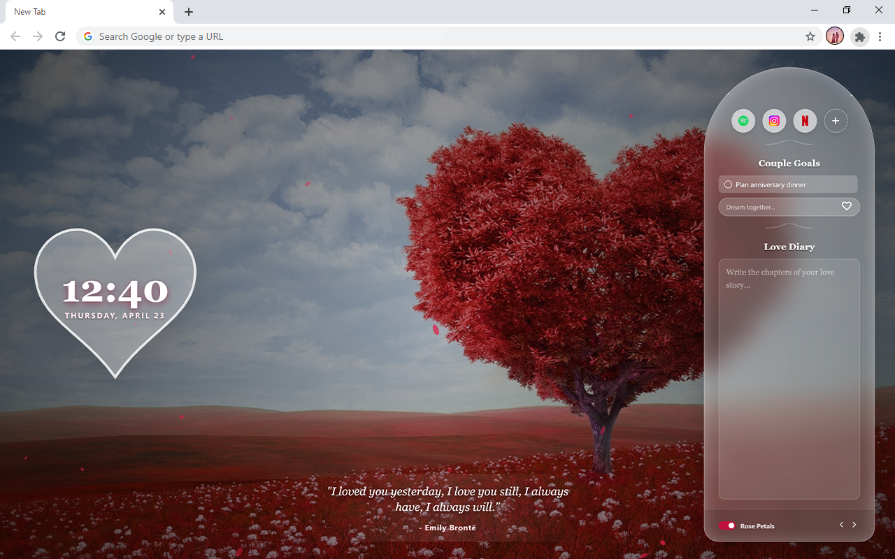Love Romantic HD Wallpaper New Tab transforms your browser into a beautiful and aesthetic workspace. We designed this extension to bring a warm atmosphere to your daily screen with clean and functional widgets.