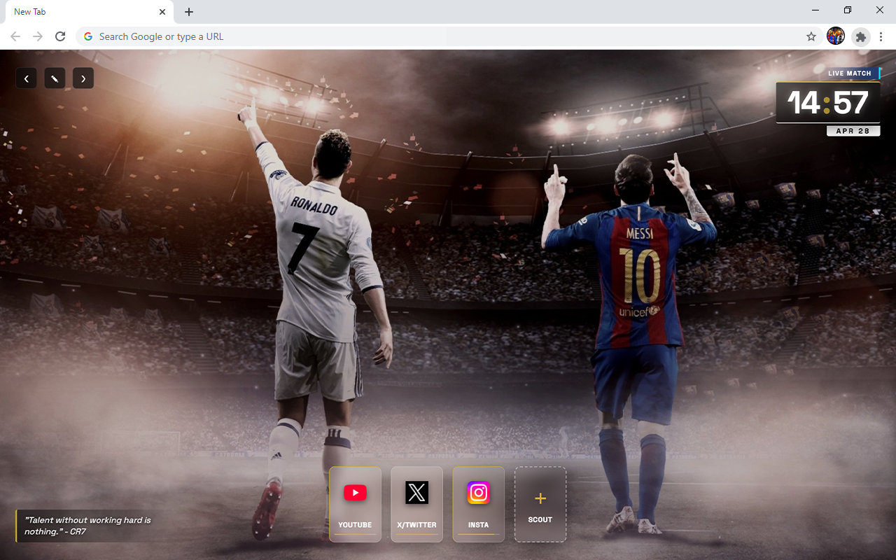 Messi vs Ronaldo HD Wallpaper New Tab brings the energy of the pitch straight to your screen, keeping your everyday browsing fast and highly functional.