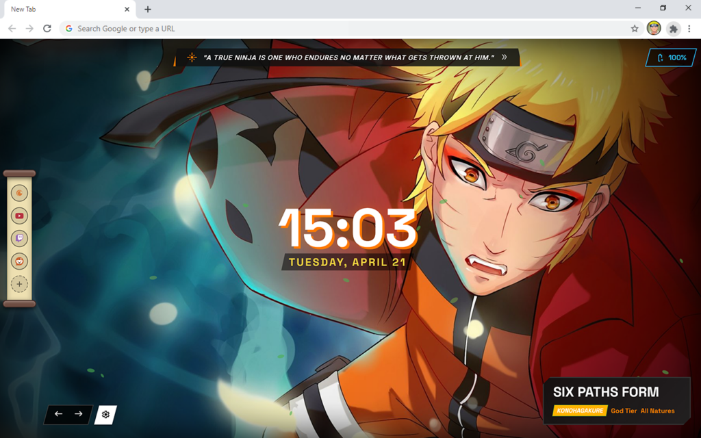 Each time you open a new tab, you get a powerful naruto background picture right on your screen. We designed this layout to give fans a clean, functional workspace that still feels like a piece of the hidden leaf village.